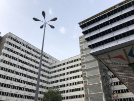 So viel leerer Raum (45.000 Quadratmeter!!) und ein abenteuerlicher Garten im Innenhof, mitten im Herzen der Stadt! Während der DDR wurden hier, in der Staatlichen Zentralverwaltung der Statistik (SZS), verschiedenste Daten gesammelt, die dann in Statistiken eingespeist wurden, durch deren Auswertung politische Entscheidungen beeinflusst wurden. Nach der Wiedervereinigung zogen dann die Bundesbeauftragten für die Unterlagen des Sicherheitsdienstes ein, die bis 2008 dort blieben. Eigentlich hätte das Gebäude 2015 abgerissen werden sollen, nachdem es seitdem leerstand. Doch eine Gruppe engagierter Künstler*innen, Architekt*innen und Politiker*innen konnten das zum Glück verhindern. Denn schließlich bietet die modulare Grundstruktur des stillen Riesen eine schon vorhandene Konstruktion, die flexibel umgenutzt werden kann.